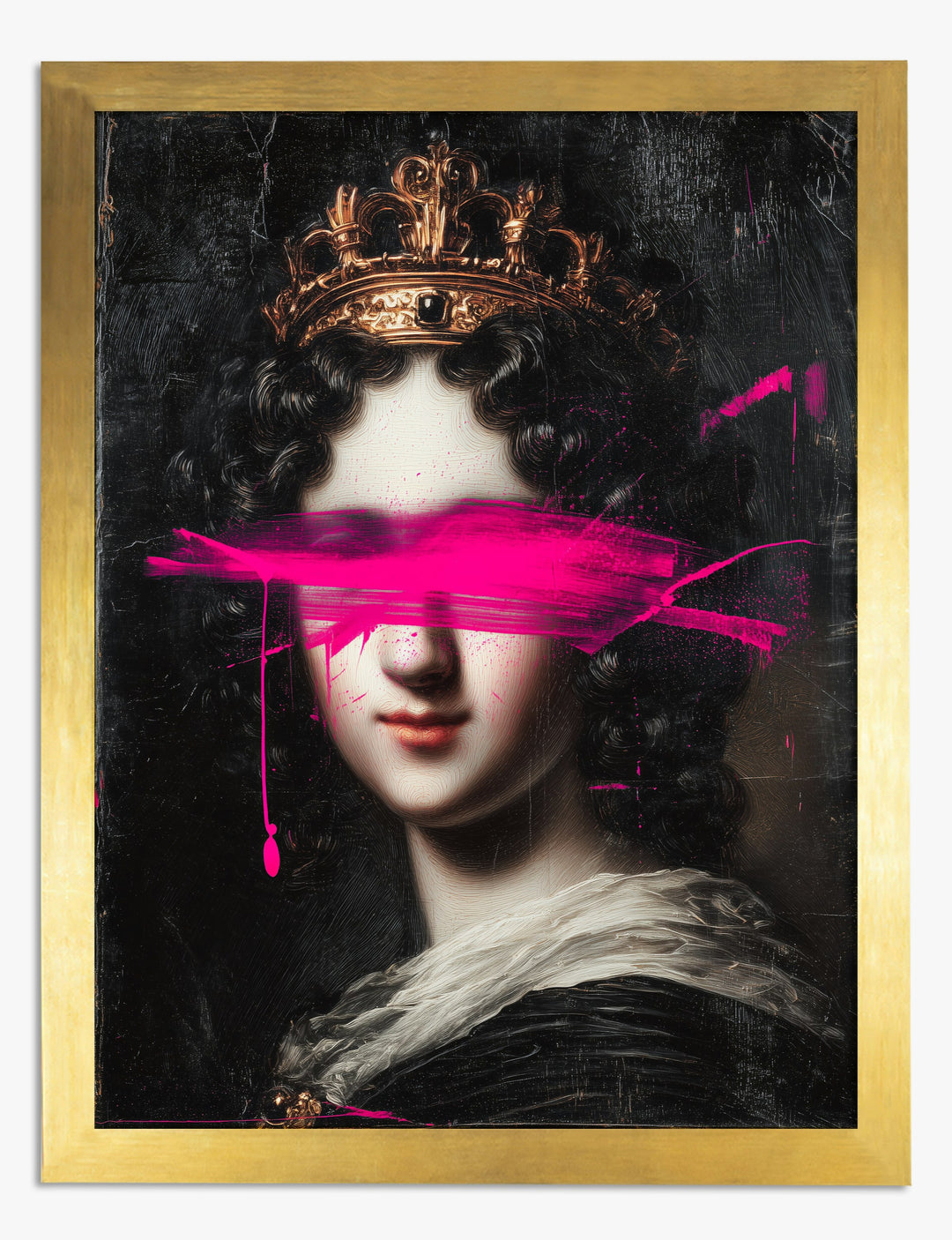 Who says royalty has to play by the rules? This bold portrait shakes up tradition, blending baroque elegance with a flash of street-smart attitude. The classic queenly pose, crowned and composed, collides with a fearless swipe of hot pink graffiti—making this piece a true conversation starter.