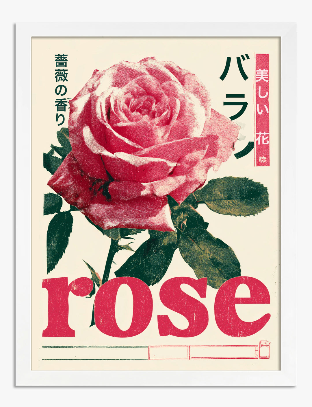 A single rose can say so much — and this one brings instant charm to your space. Vintage-inspired Japanese typography meets a bold, romantic bloom, blending nostalgia with modern flair. The soft pinks and lush greens pop against a creamy background, making it a statement piece that feels both fresh and timeless.