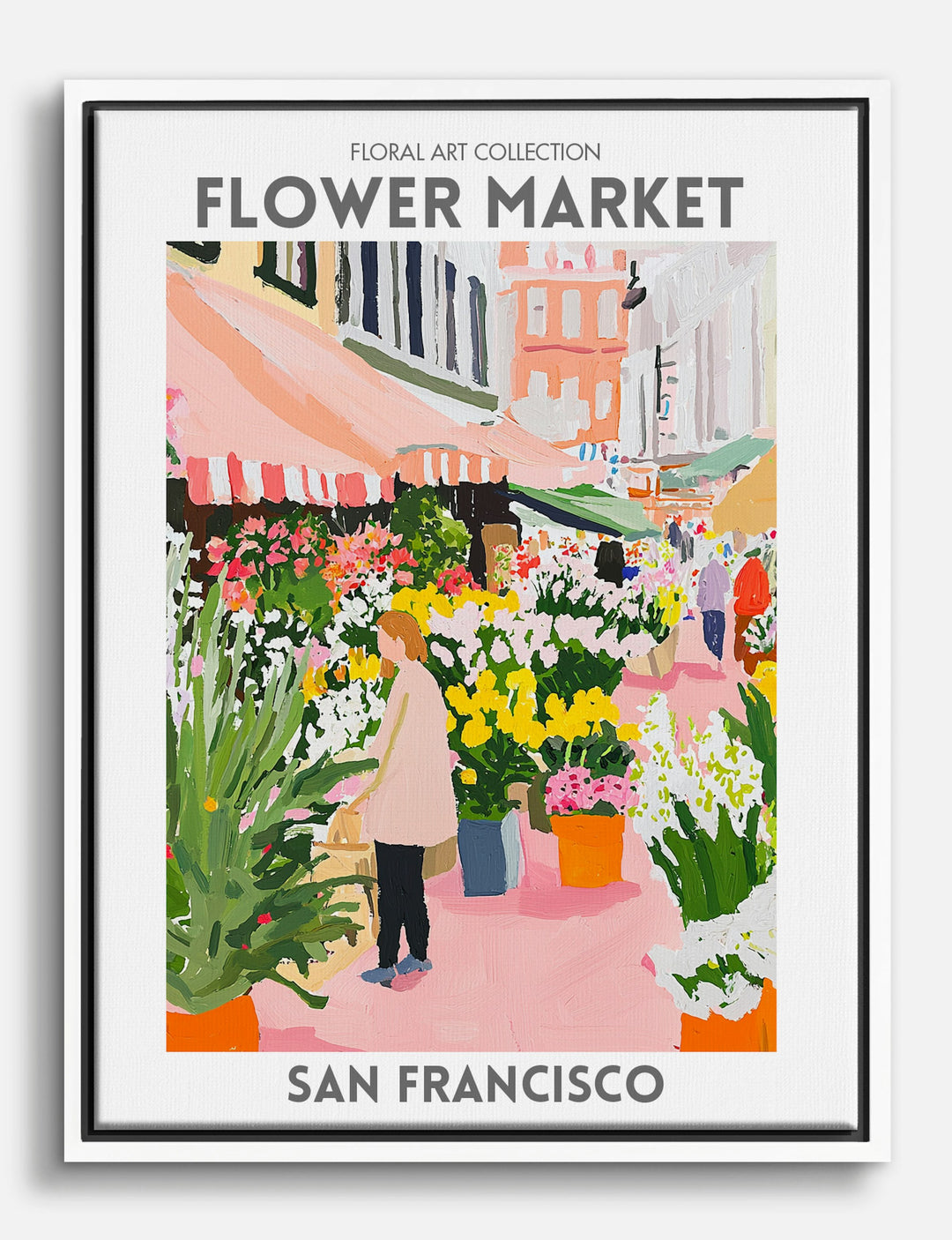 Step into a world of vibrant blooms with this enchanting piece inspired by the lively markets of San Francisco. The vivid colors and bustling scene bring a touch of joy and energy to your space, making it perfect for brightening up your living room or kitchen. Let the playful palette of pinks, greens, and yellows complement your decor, infusing your home with effortless style and charm.