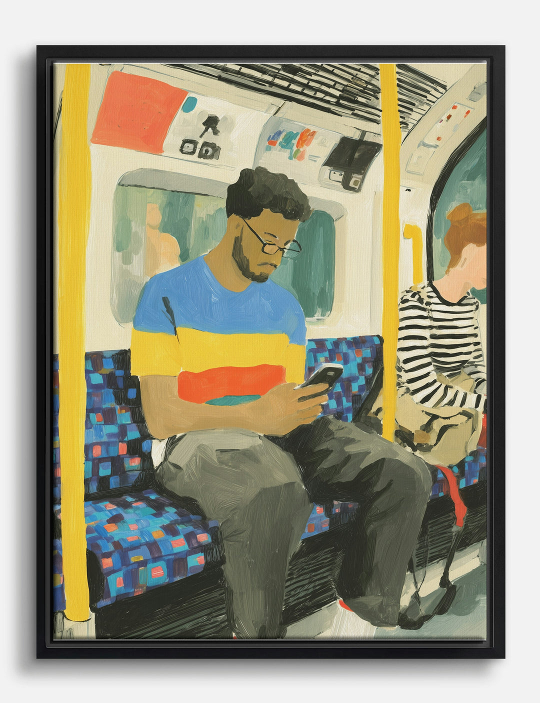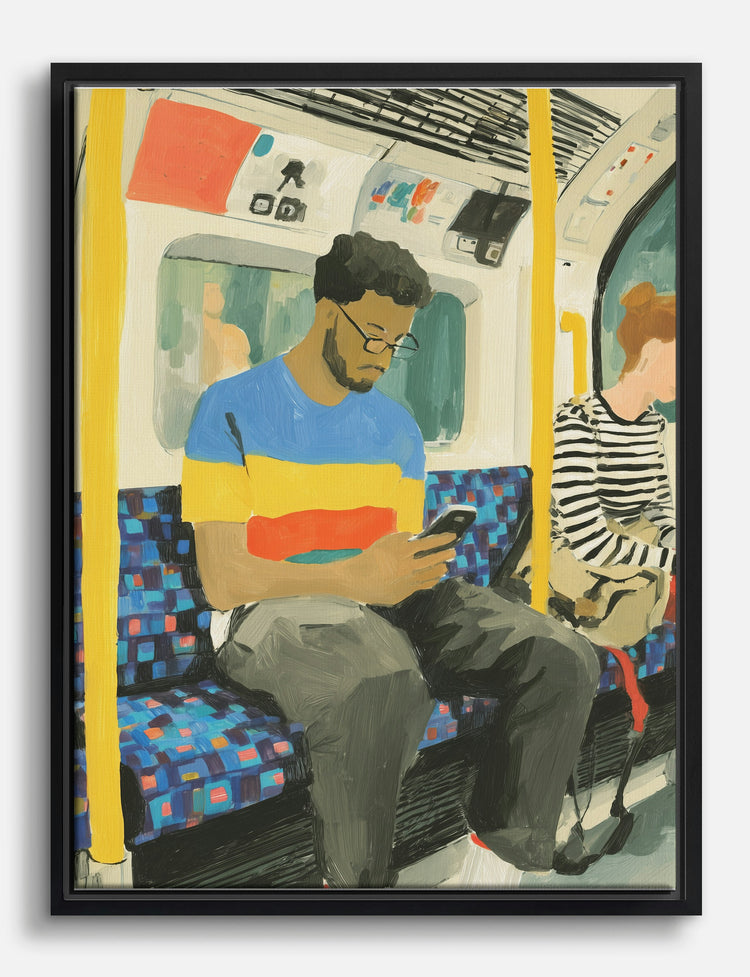City life, captured in a candid moment — this piece brings the subtle energy of everyday journeys straight into your space. Notice the bold color blocks and relaxed posture, inviting you to slow down and savor the present, even on your busiest days.