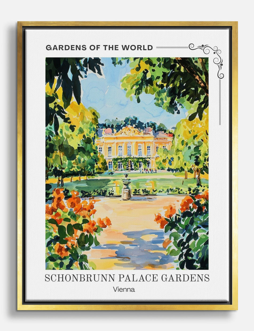 Step into a world of vibrant beauty with this captivating depiction of the Schonbrunn Palace Gardens. Bursting with lush greens and sunny yellows, this piece brings a touch of Vienna’s elegance to your space. Perfect for the living room or office, it effortlessly complements both modern and vintage decor styles, inviting a sense of pride and joy into your home.