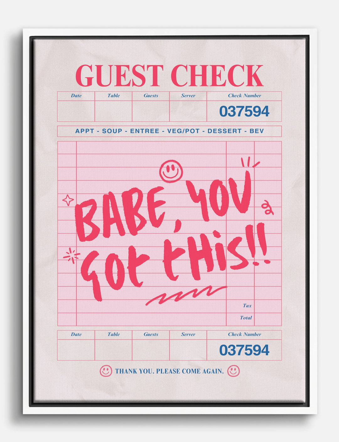 Bold, playful, and full of good vibes—this piece is a pep talk you can hang on your wall. A classic diner guest check gets a fun twist in vibrant pink, reminding you (or your favorite person) that you’re unstoppable.
