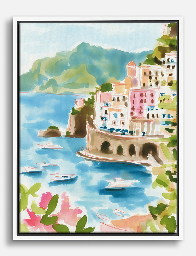 Sun-washed cliffs and pastel villas spill into sparkling blue waters in this breezy watercolor scene. It’s like stepping into a sunlit Mediterranean day, where every glance brings a fresh sense of possibility and wanderlust.