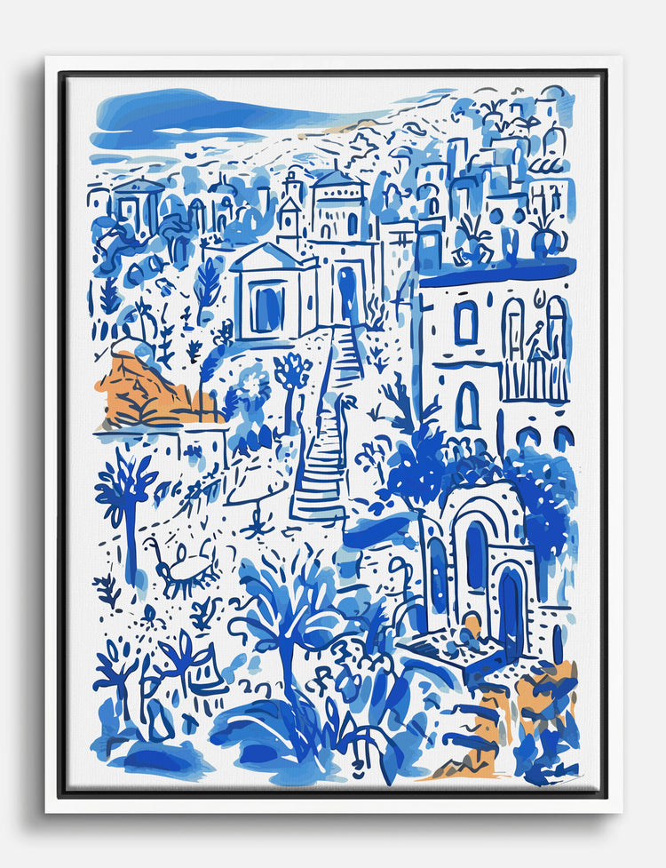Feel the charm of the Amalfi Coast every day with this captivating illustration. Its vibrant blue hues and whimsical details bring a touch of Italian elegance to any room. Perfect for your living room or bedroom, this piece effortlessly complements both modern and vintage decor styles. Let your space tell a story of wanderlust and style.