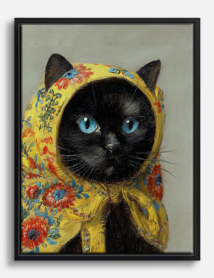A burst of personality meets timeless charm — meet the feline muse your walls have been waiting for. Those striking blue eyes and that whimsical yellow headscarf instantly spark curiosity and conversation, turning any blank space into a story worth telling.