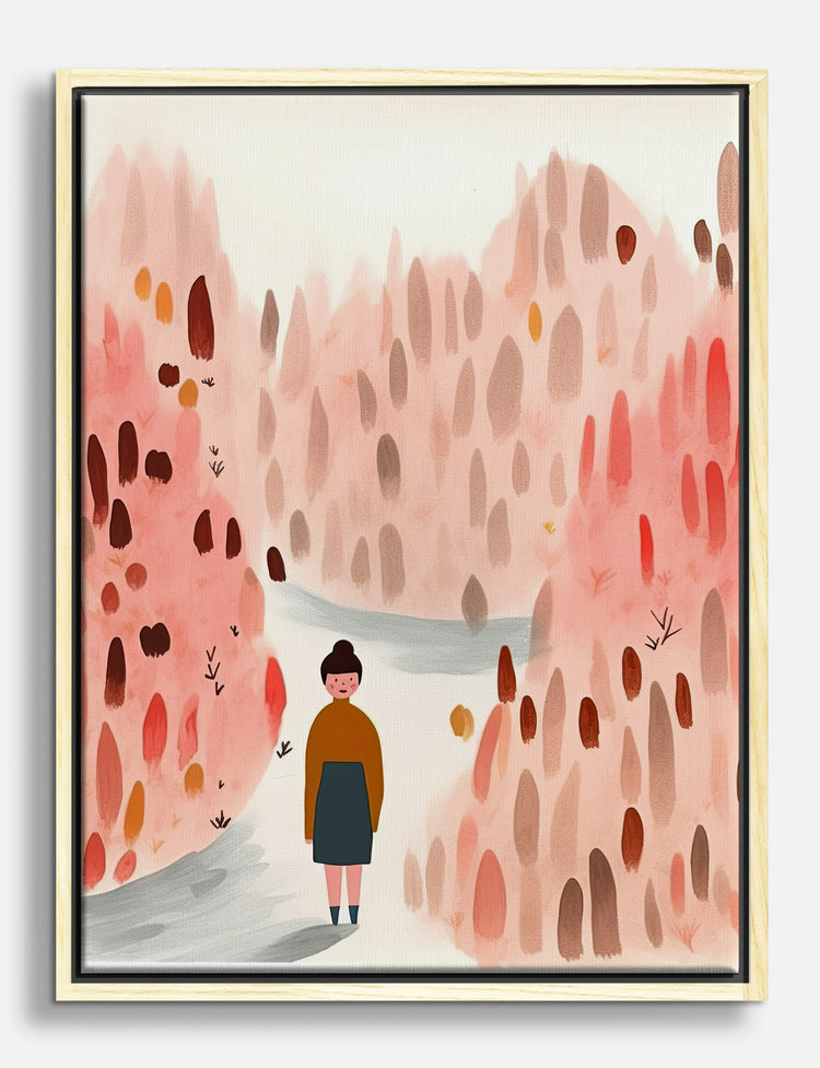 Soft blush hills and playful brushstrokes set the scene for quiet adventure in this whimsical landscape. A lone figure strolls a winding path, inviting you to pause, breathe, and find magic in the everyday.