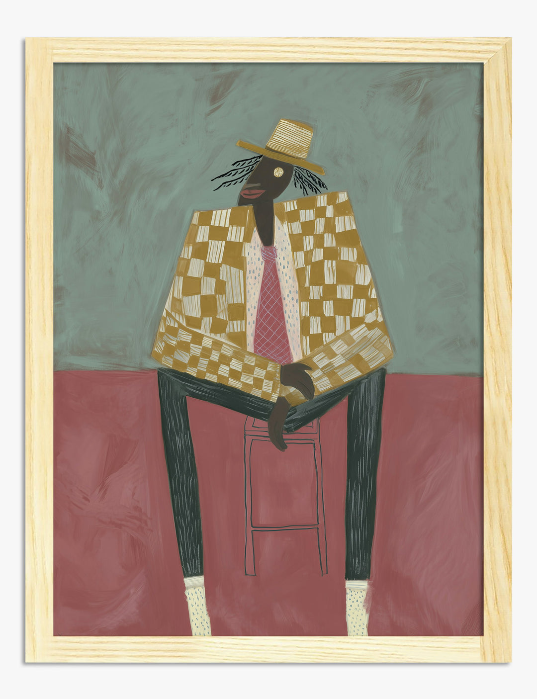 Ever wish your walls could talk? This piece brings a whole new attitude to your space—effortlessly cool, endlessly confident. The bold checkerboard jacket and straw hat create a vibe thats both relaxed and unmistakably stylish, making any room feel instantly more interesting. Picture this in your living room or office, where its earthy golds, soft reds, and muted greens pop against modern or vintage decor. It’s the kind of artwork that doesn’t just hang—it owns the room, helping you express your unique style with zero stress. You’ll love how it sparks conversation and adds a sense of artistic pride to your home. With Fab, transforming your space is easy—just add a little swagger to your walls.