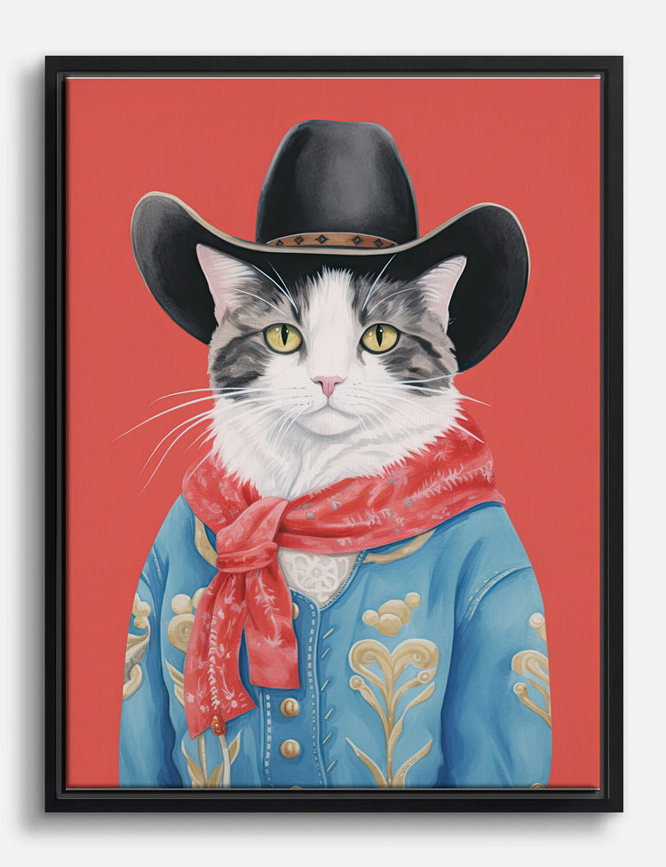 Bold style meets playful spirit with this unforgettable cowboy cat. His steady gaze and classic Western getup instantly inject a dose of personality into any room. Whether you hang him in your living room or office, youll love the way his vibrant red scarf and powder-blue jacket pop against the warm backdrop.