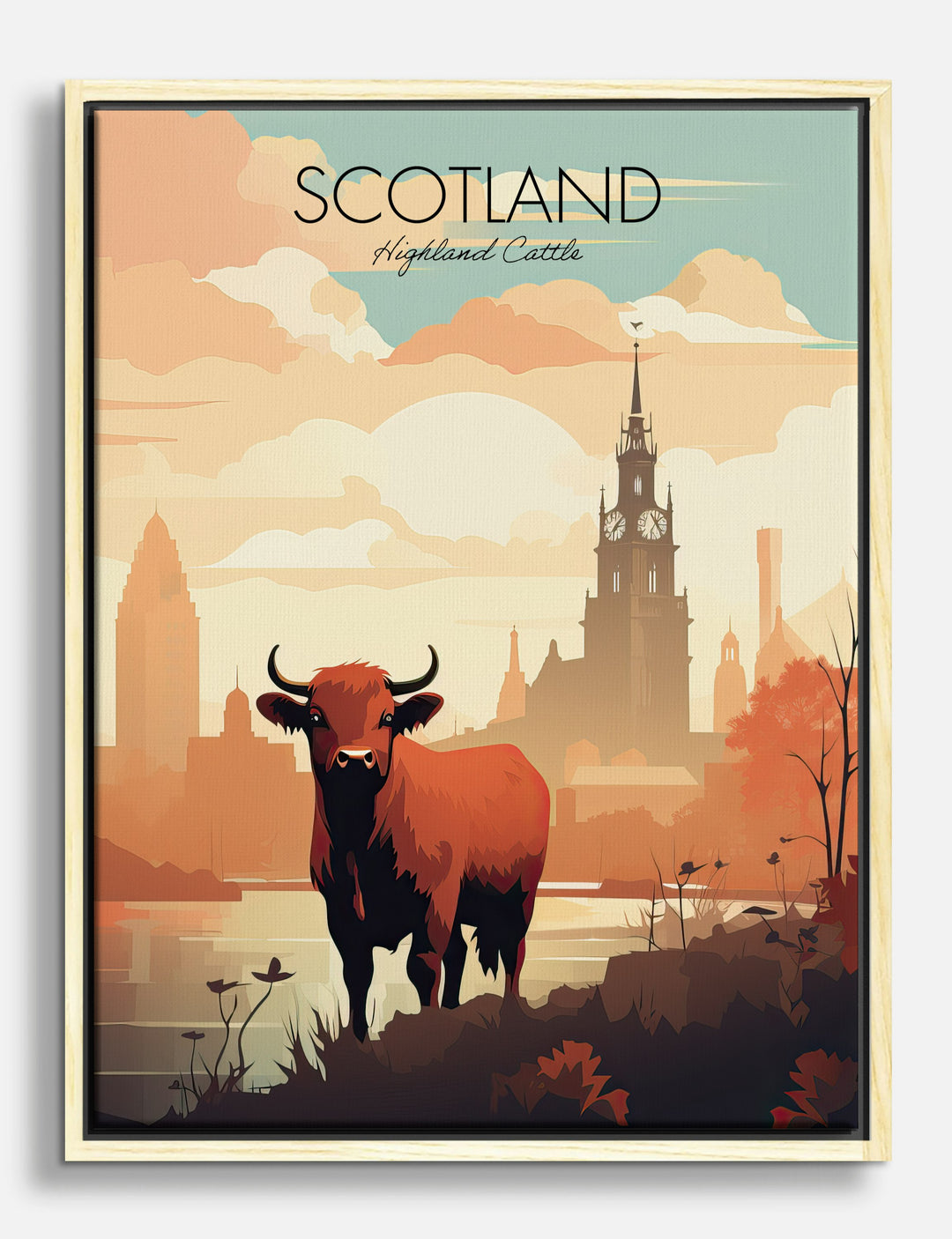 A bold Highland cow stands against the romantic skyline of Scotland, inviting adventure and warmth into any room. The soft oranges and dusky blues set a cozy, grounded vibe—perfect for your living room or bedroom sanctuary.
