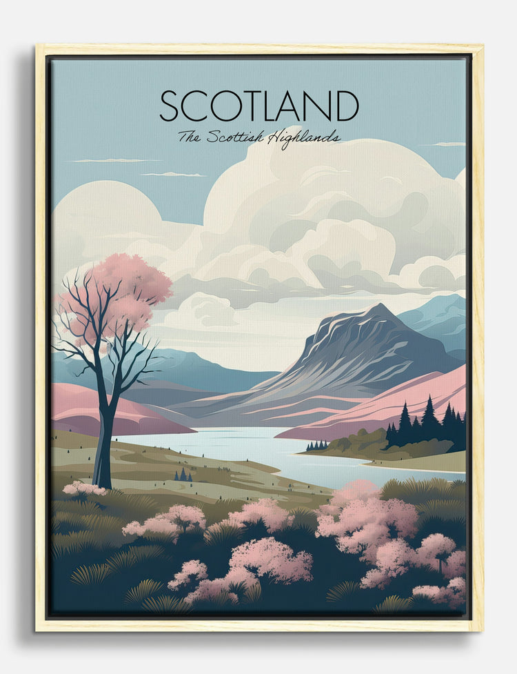 Soft blush pinks and tranquil blues bring a breath of Scottish air right into your home. This landscape feels like a gentle invitation to slow down, savor the view, and let your space feel instantly more open and calm.