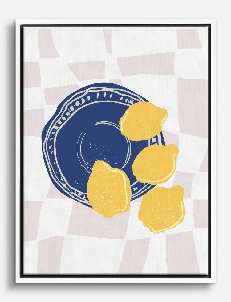 Bright pops of yellow meet relaxed, playful lines in this cheerful still life. Whether youre savoring your morning coffee or prepping dinner, this piece brings a fresh, sunny vibe to your kitchen. The bold blue and vibrant lemons add instant personality, making your space feel both welcoming and uniquely yours.