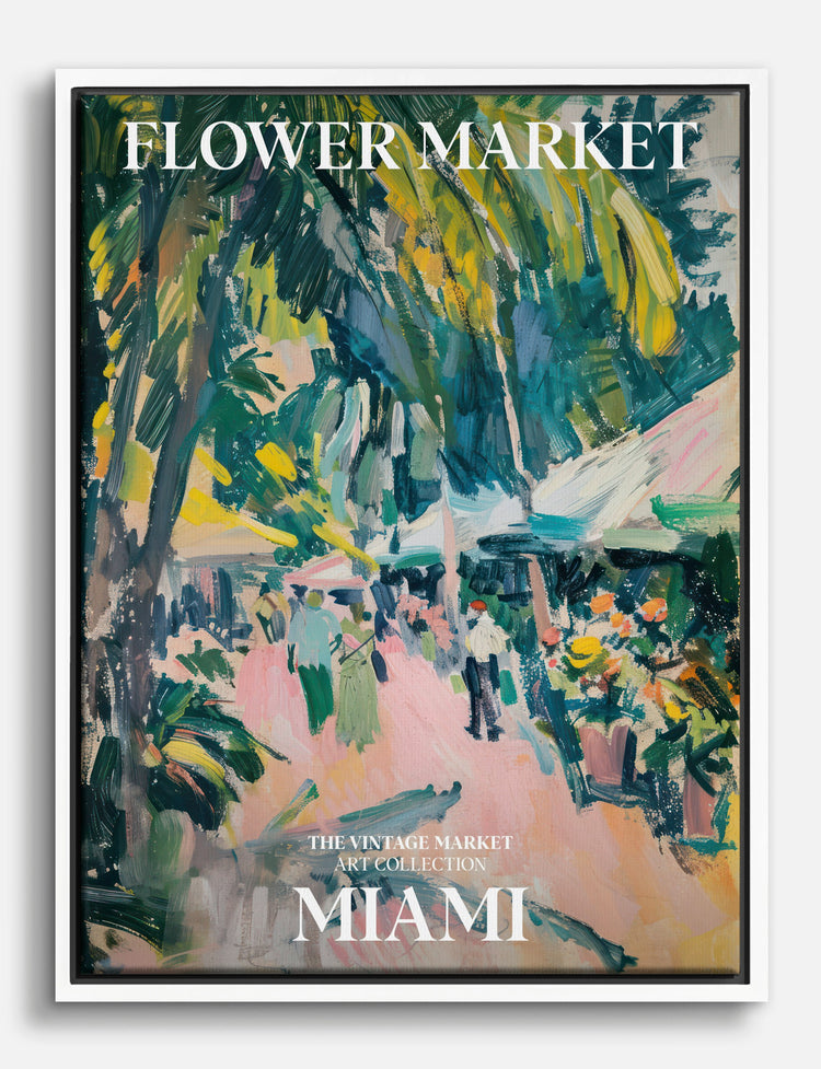 Sun-drenched palms and lively brushstrokes bring the energy of Miami’s flower markets right into your home. This vibrant piece sets a fresh, joyful vibe, perfect for brightening up your living room or adding a pop of color to your entryway. The lush greens and soft pinks play beautifully with both modern and vintage decor, making it easy for you to create a space that feels unique and inviting. Let your walls tell a story of sunshine, style, and effortless transformation.