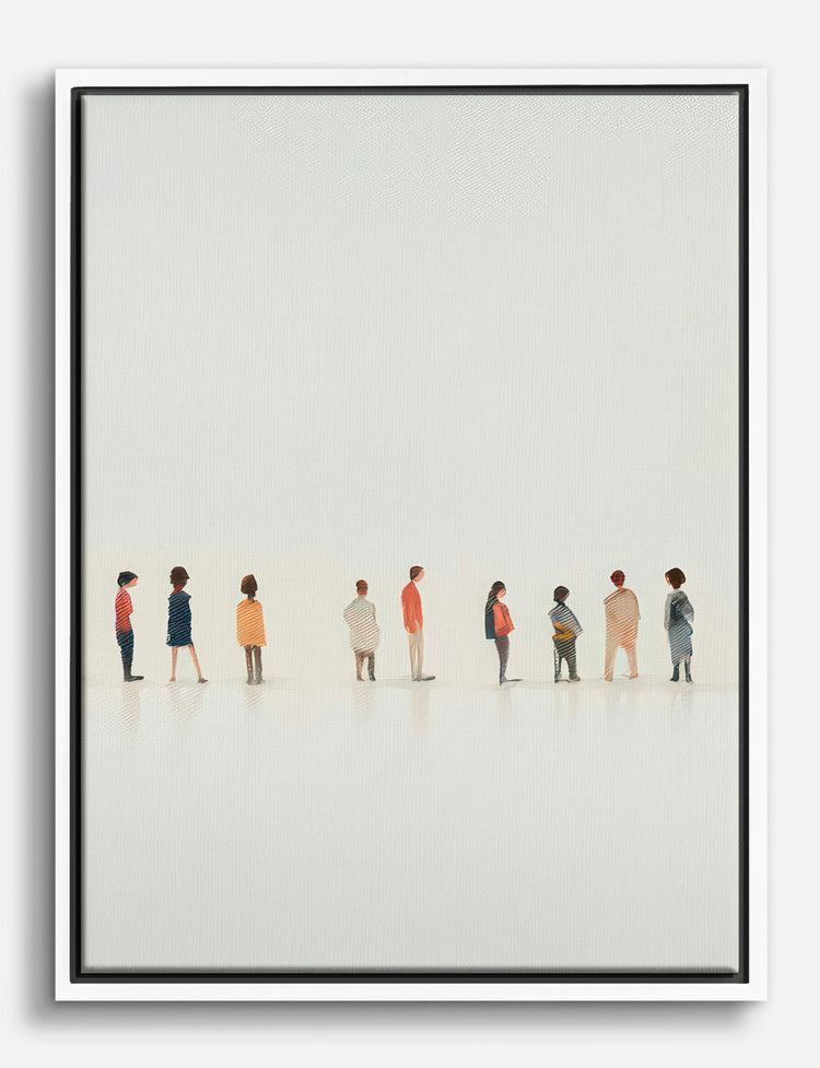 Feel the quiet elegance of minimalism with this captivating piece. A line of diverse human figures stands against a serene backdrop, creating a sense of calm and connection. Perfect for your living room or office, its soft hues and simple design effortlessly complement any decor style, adding a touch of modern sophistication. Let this artwork inspire pride and self-expression in your home.