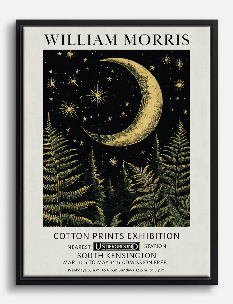 Let the enchanting glow of a crescent moon and twinkling stars transform your space. This William Morris-inspired piece brings a touch of vintage charm and celestial wonder to your walls. Perfect for a cozy bedroom or a serene living room, its deep, earthy tones complement both modern and classic decor. Experience the magic of the night sky and let your home reflect your unique style.
