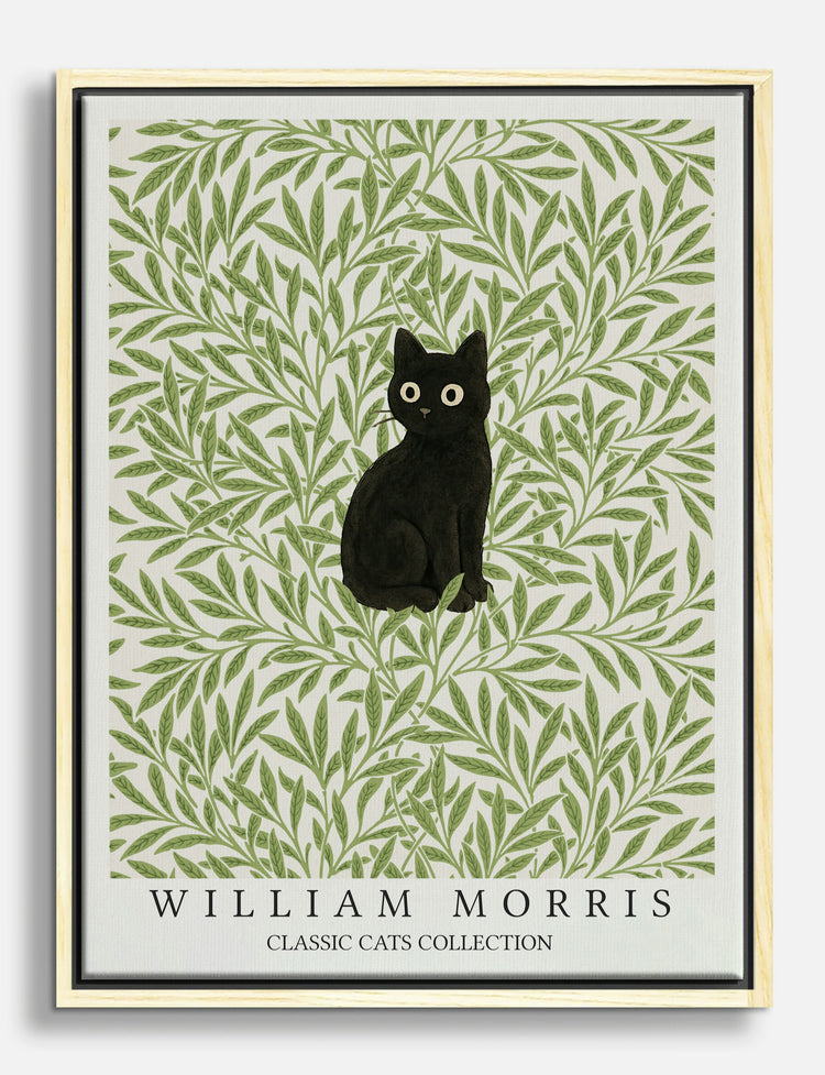 A curious black cat sits poised among lush, leafy greens — a pop of character and calm for your space. This piece brings a delightful sense of whimsy and vintage elegance to any room, blending classic William Morris patterns with irresistible feline charm.