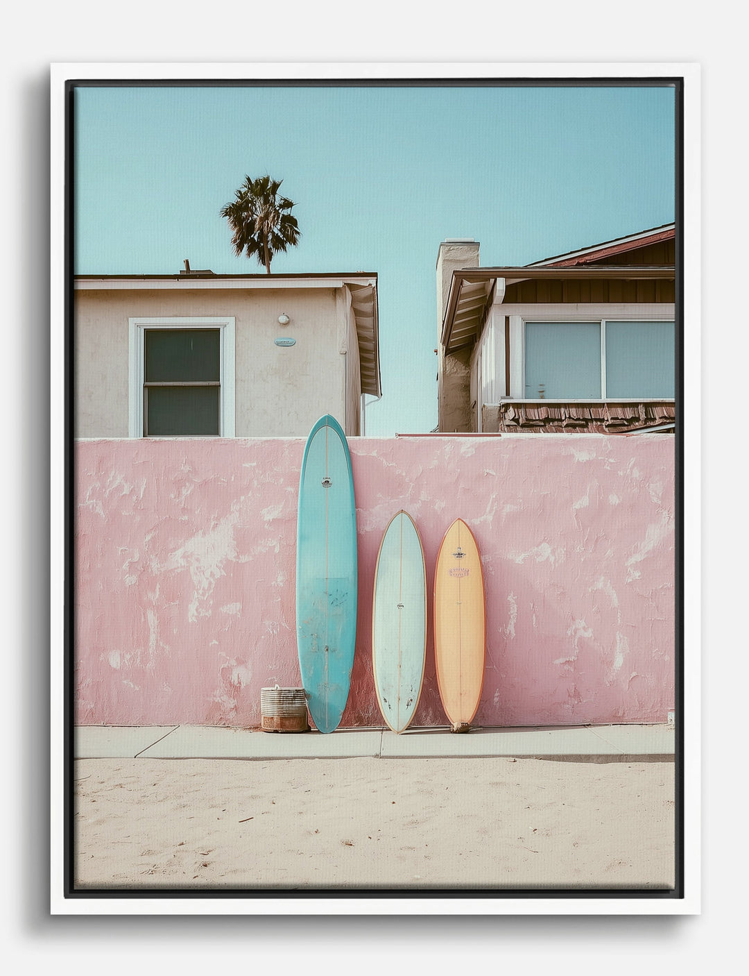 Sun-drenched and effortlessly cool, this piece brings the laid-back energy of the coast right into your home. Three surfboards in soft pastels lean against a sun-faded pink wall, framed by classic beach houses and a single palm — it’s a snapshot of endless summer. Looking to give your living room or bedroom a relaxed, California-inspired upgrade? This print pops on neutral walls and pairs perfectly with both modern minimalism and eclectic, boho decor. The gentle blues, peaches, and pinks breathe fresh air into any space, reminding you every day that life’s better with a little surf and sunshine. You don’t need a beach house to channel that easygoing, playful style — just a spot on your wall and a love for all things breezy and bright.
