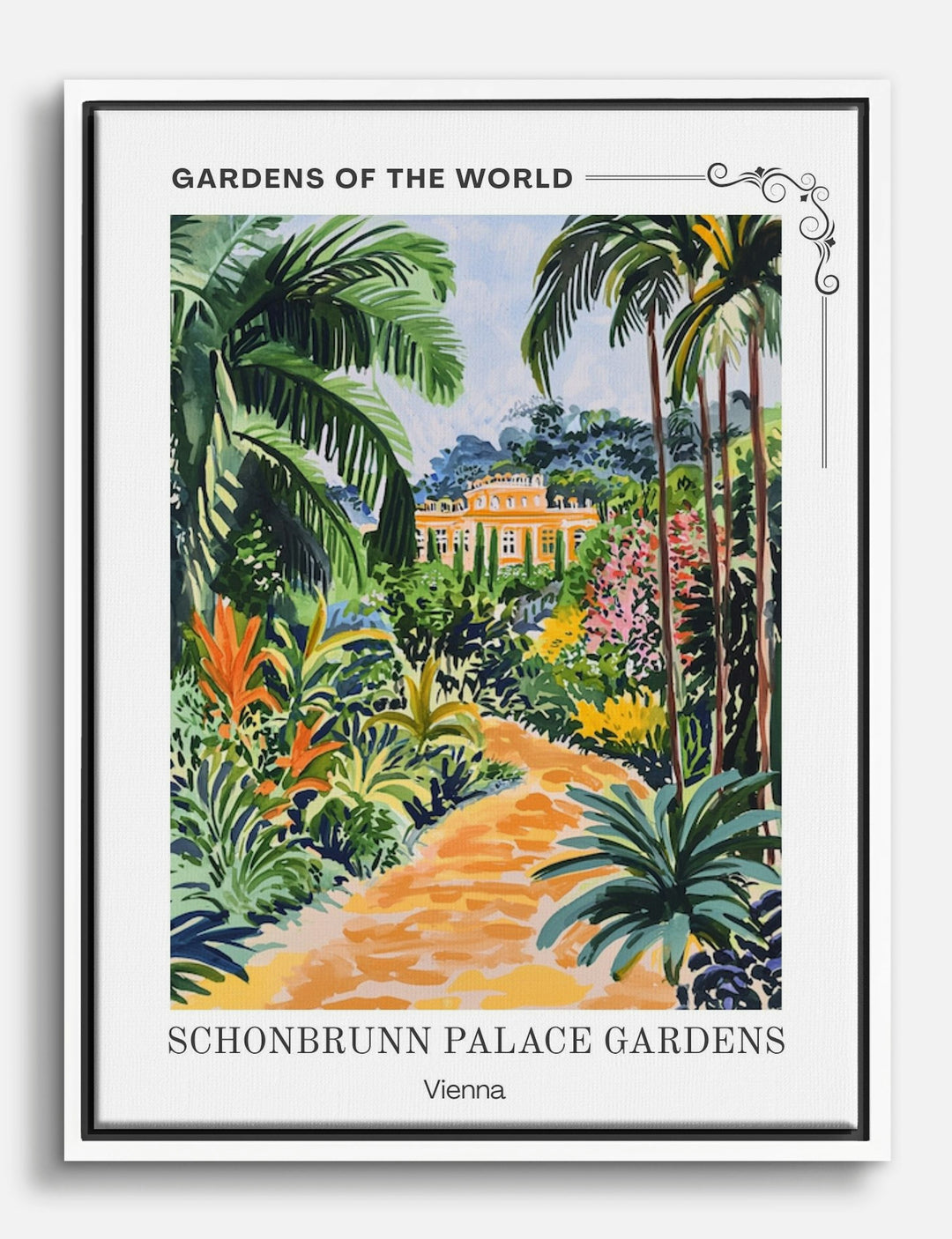 Step into a lush paradise with this vibrant depiction of the Schönbrunn Palace Gardens. The vibrant greens and warm oranges create a lively, inviting atmosphere, perfect for your living room or office. Let this piece transport you to a world where every day feels like a serene escape, effortlessly complementing both modern and bohemian decor styles. Bring home a touch of Viennas elegance and transform your space into a botanical haven.