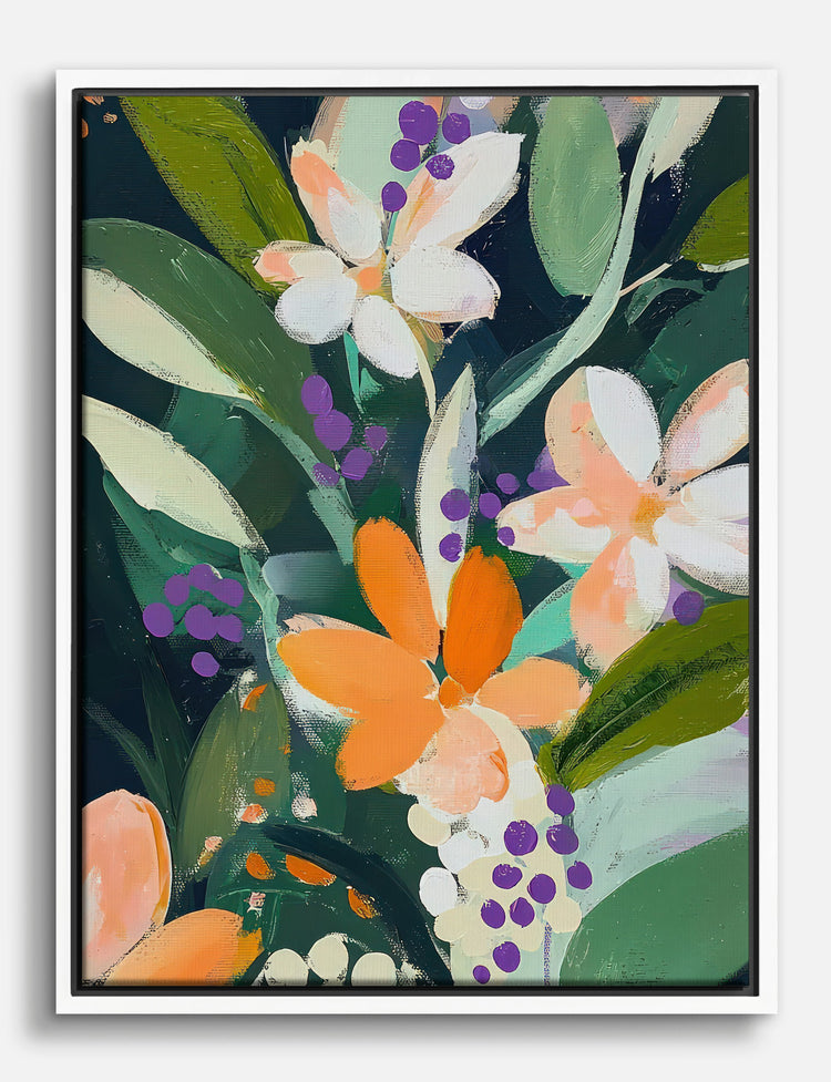 Let your walls bloom with vibrant energy. This lively floral piece, bursting with orange and purple hues against lush greenery, transforms any space into a garden of inspiration. Perfect for your living room or bedroom, its bold colors effortlessly complement modern and bohemian styles. Feel the joy and pride of a uniquely styled home with this affordable, stunning artwork.