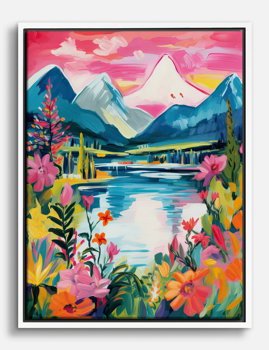 A rush of color greets you every time you walk in—lush florals, tranquil water, and bold pink skies breathe new life into your space. This piece is pure optimism on your wall, inviting you to unwind and dream bigger. Let it pop in your living room or bring a playful, uplifting vibe to your bedroom. The energetic palette works with both modern and eclectic styles, making it easy to transform your home into a joyful, expressive retreat.