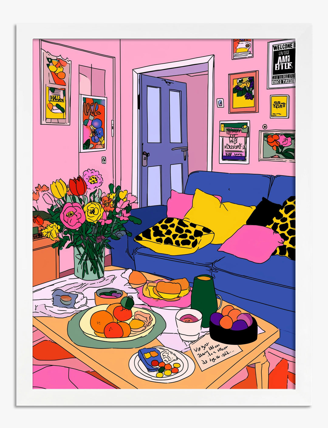 Step into a world where color rules and every detail sparks joy. This playful illustration transforms your walls into a celebration of everyday comfort—think fresh flowers, cozy cushions, and a breakfast spread that invites you to linger.