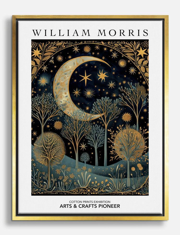 Step into a whimsical night with William Morriss Moonlit Forest. This enchanting piece brings a touch of magic to your space, with its shimmering stars and crescent moon casting a serene glow over a mystical woodland. Perfect for your living room or bedroom, the rich navy and gold palette complements both modern and vintage decor. Let this artwork transform your home into a haven of style and tranquility, where every glance invites a moment of wonder and pride.