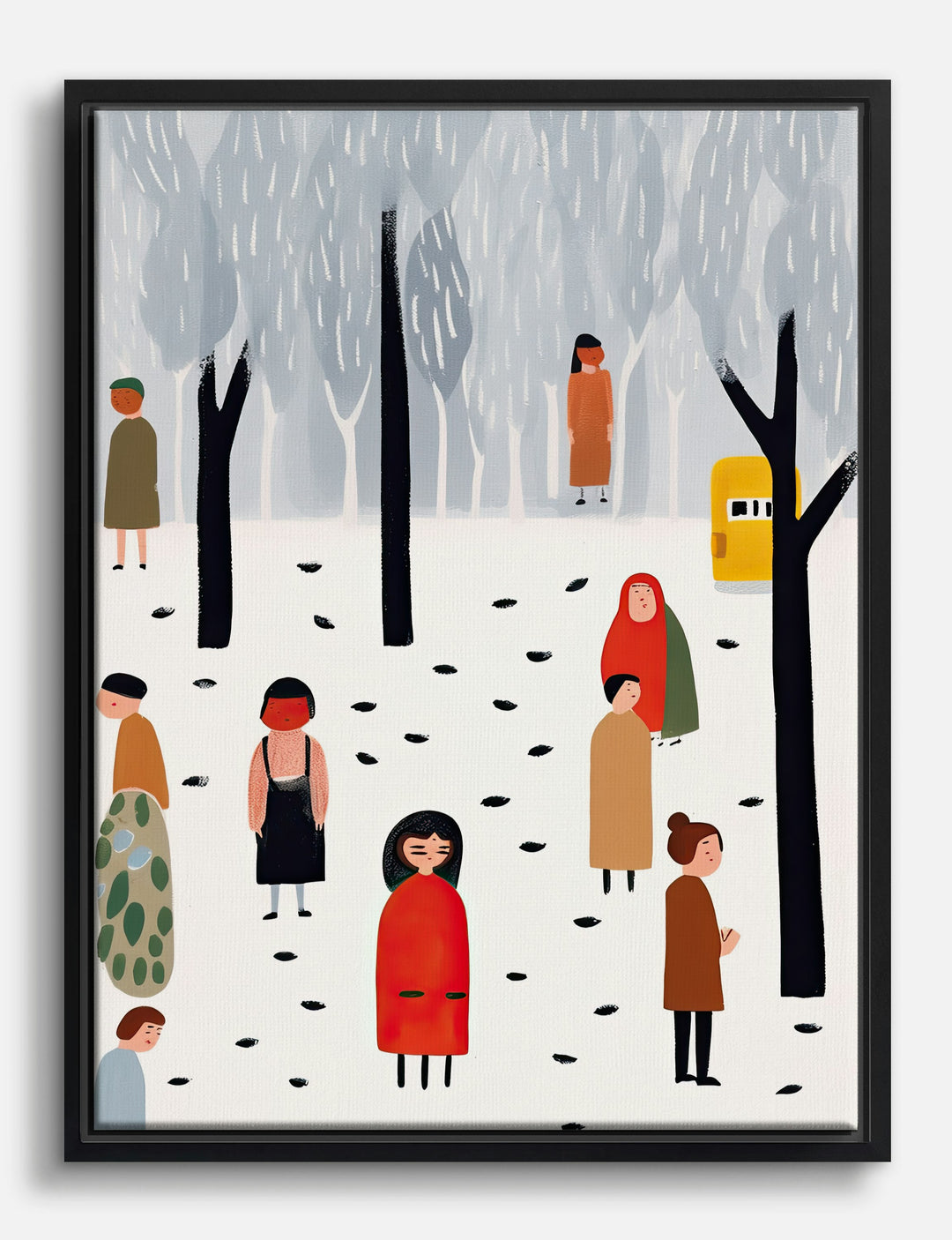 Bold pops of red and mustard turn a snowy stroll into a playful gathering in this charming piece. Each figure feels like a story waiting to be told, inviting warmth and curiosity into your home. Hang it in your living room or entryway to instantly energize your space—its crisp palette and modern style make it a standout that complements everything from minimalist to eclectic decor. Youll love how it sparks conversation and adds a dash of city magic to your everyday.