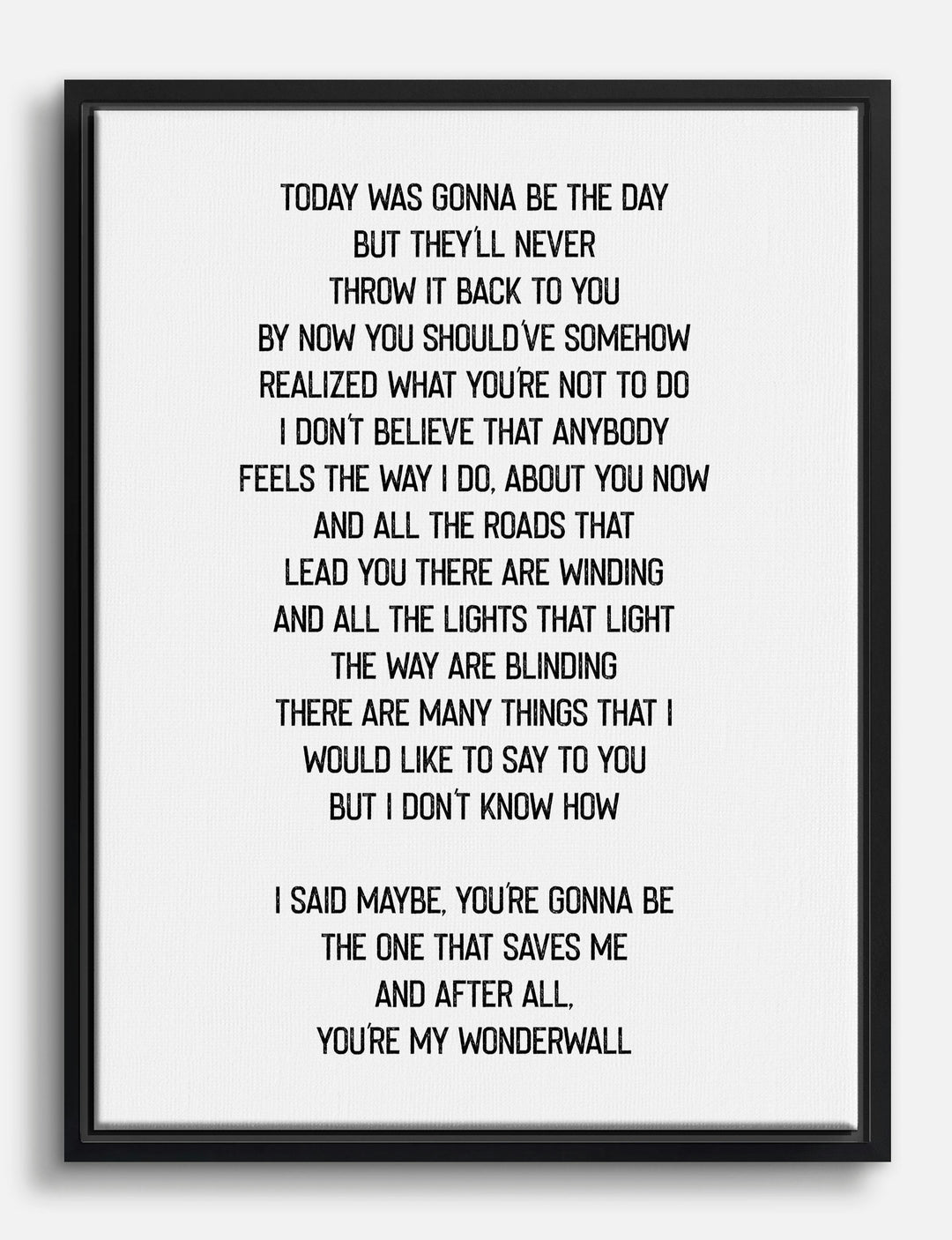 Bold lines and iconic lyrics come together in this typography piece, infusing your space with the spirit of an anthem. Whether it’s the heart of your living room or the sanctuary of your bedroom, these words bring a sense of nostalgia and inspiration — a daily reminder that you’re someone’s wonderwall. The crisp black-and-white palette pops against any wall, making it effortless to style and impossible to ignore. Give your home a touch of Britpop pride and let your personality shine.