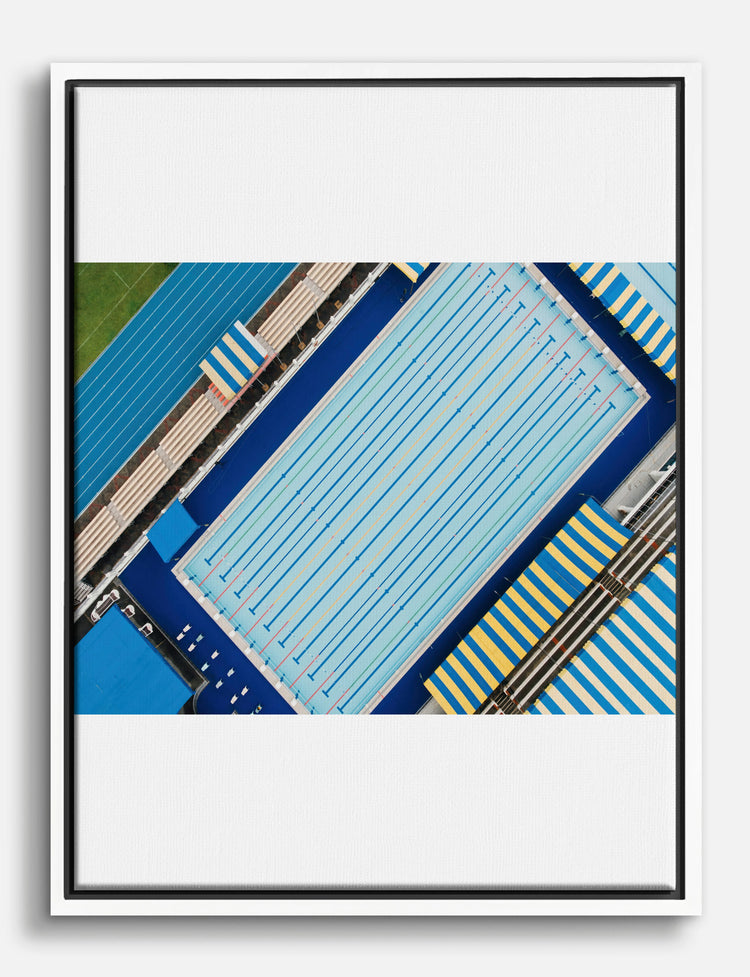 Dive into a world of refreshing style with this captivating aerial view of a swimming pool. The striking geometric patterns and vibrant blues create a modern oasis, perfect for adding a splash of color to your living room or home office. This piece effortlessly blends with minimalist and contemporary decor, making it an ideal choice for those who love a touch of aquatic charm. Let this artwork transform your space into a sanctuary of relaxation and style.