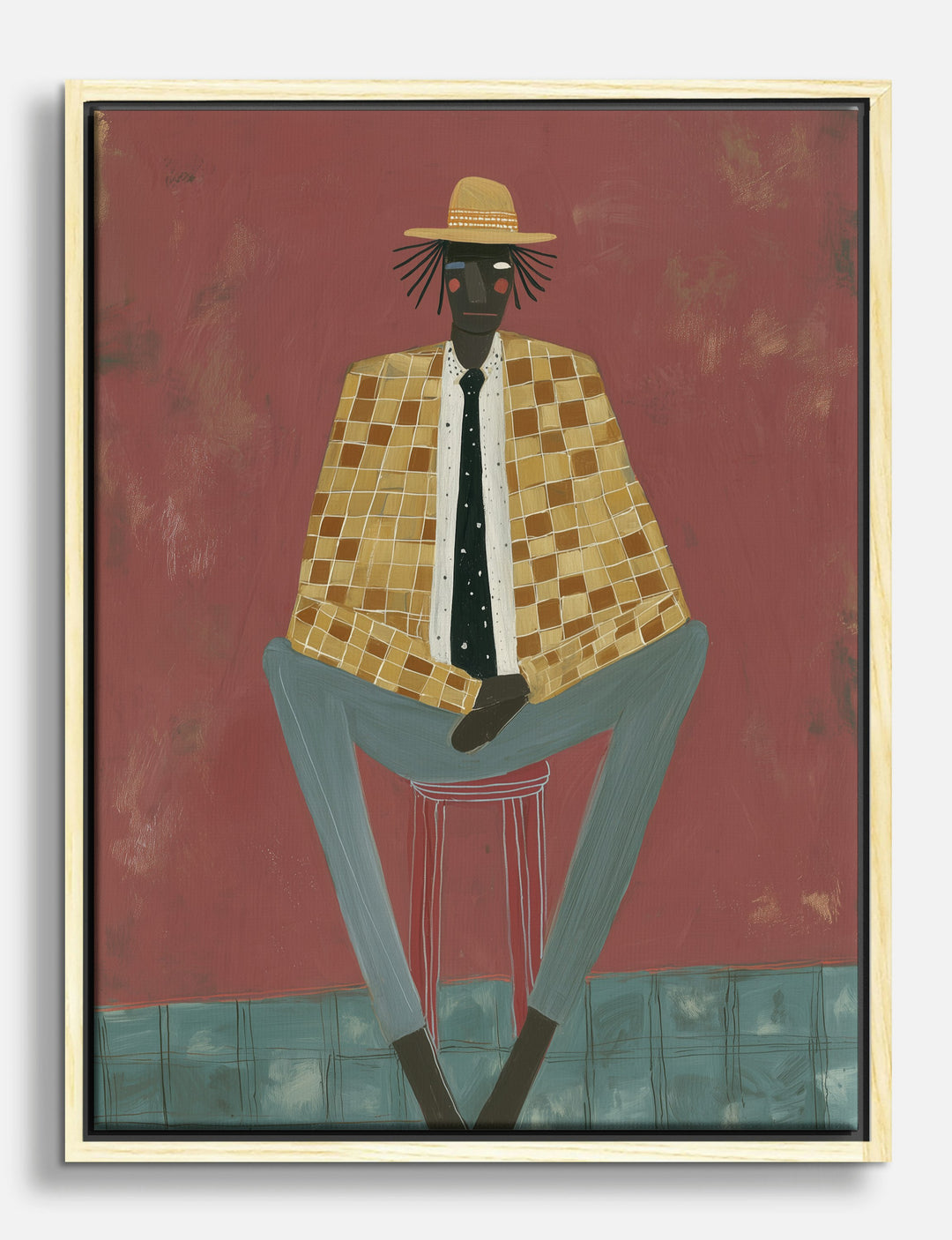Bold confidence takes a seat in your home with this striking portrait. The golden checkered jacket and cool straw hat radiate effortless style, while the deep terracotta backdrop brings warmth and energy to your space. Imagine this on your living room wall—instantly transforming a quiet corner into a statement of individuality and charm. The earthy, inviting palette pairs beautifully with modern, vintage, or eclectic decor, making it easy to express your own unique taste. Let this piece remind you daily: your space is a reflection of your story, and great style is always within reach. Go ahead—give your home a dash of personality that’s as original as you are.