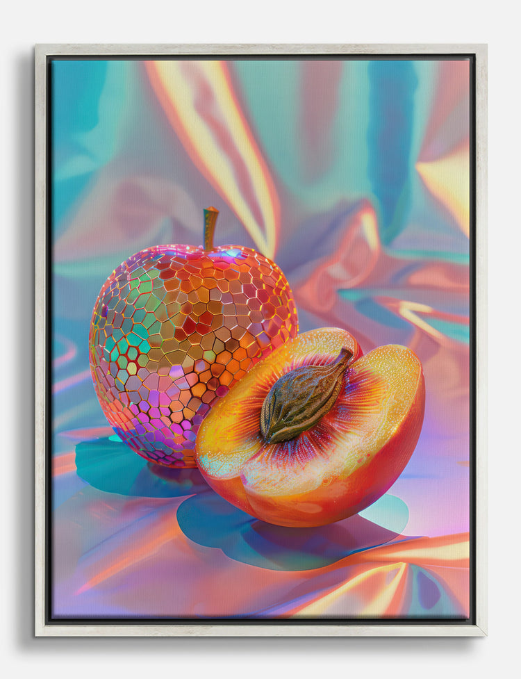 Bold, playful, and totally unexpected—this piece brings the party straight to your walls. A shimmering disco-inspired peach glows with iridescent colors, instantly energizing any space with a sense of fun and originality.