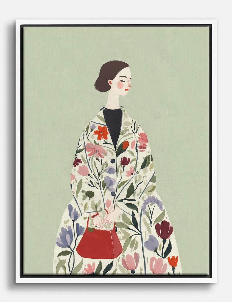 Step into a world where fashion and florals strike a perfect balance. This captivating piece features a poised woman draped in a coat bursting with vibrant blooms, her red handbag adding a playful pop. It’s the kind of art that instantly freshens up your space—think of it as a statement jacket for your walls. Hang it in your living room or bedroom to create a space that feels both chic and inviting. The soft sage background and lively floral palette blend seamlessly with modern, minimalist, or even bohemian decor. You’ll love how this artwork brings a sense of creative confidence and effortless style to your home. Let your walls tell a story as unique as you are—no renovation required.