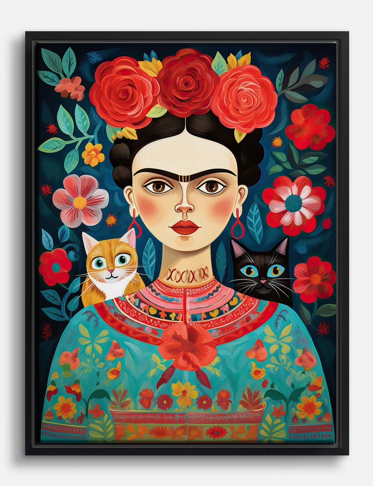 Bold blooms, vivid color, and a fearless gaze—this piece radiates confidence and creativity. Let Frida’s iconic spirit and her whimsical cat companions bring a burst of personality to your space.