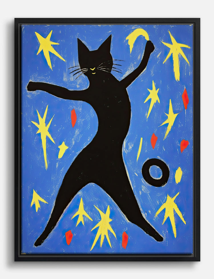Daring, playful, and utterly unique—this piece is pure joy in feline form. A bold black cat leaps across a vibrant blue sky, surrounded by bursts of yellow and red, bringing instant energy to any wall.