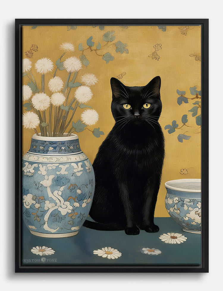 A black cat with golden eyes sits poised among delicate blue-and-white vases and soft floral accents, bringing instant intrigue and elegance to your space. This piece has a quiet confidence—perfect for your living room or bedroom, where a touch of mystery and charm goes a long way. The rich gold and deep blue tones play beautifully with both modern and vintage décor, helping you create a home that feels uniquely you. Let your walls tell a story of style and personality—without breaking the bank.
