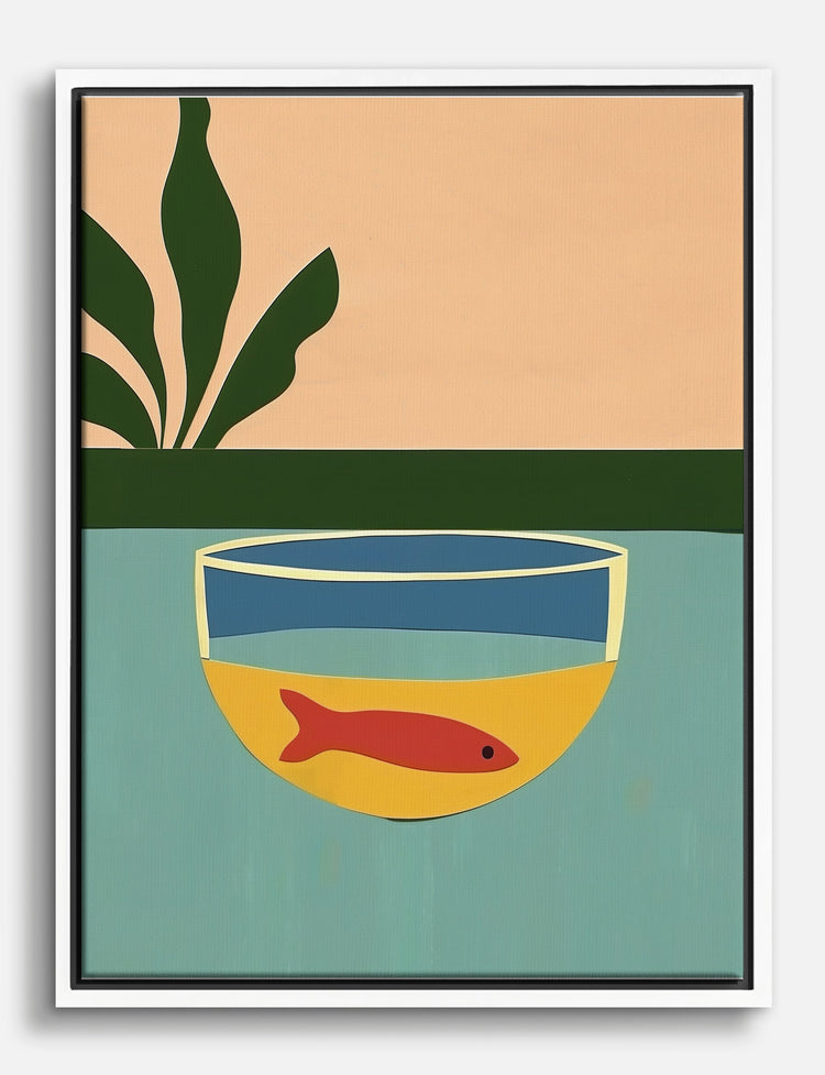Dive into tranquility with this charming fishbowl artwork. Its soothing colors and playful design create a serene atmosphere, perfect for brightening up your living room or bedroom. The harmonious blend of teal and orange complements a variety of decor styles, adding a touch of whimsy and joy to your space. Transform your home effortlessly with this unique piece, and feel a sense of pride and creativity every time you walk by.