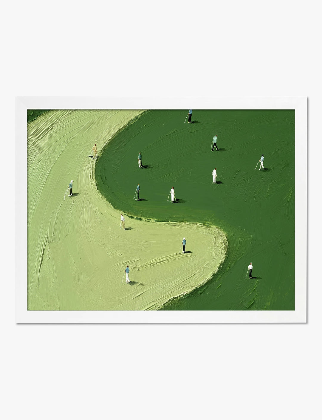 A swirl of lush greens and gentle curves brings a sense of playful calm to your space. This piece captures the quiet focus of golfers, seen from above, like a living yin-yang of sport and serenity. It’s a subtle statement that invites you to pause, breathe, and enjoy the harmony of movement and stillness. Perfect for your living room, office, or anywhere you want to add a fresh, grounded vibe. The soothing green palette pairs effortlessly with both neutral and modern decor, instantly making your space feel more connected and alive. Let this print remind you every day that style can be both bold and balanced — and that your home should always reflect your unique rhythm.