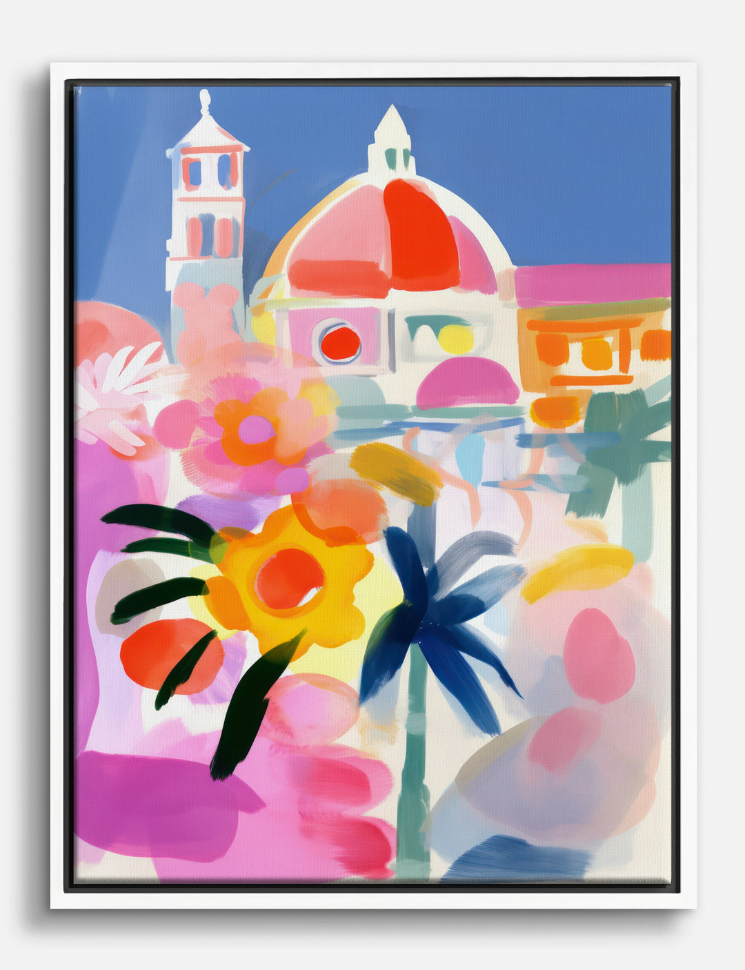 Bold color and sunlit energy burst from every brushstroke in this joyful take on Florence. Imagine bright florals and iconic domes turning your living room into a daily celebration—this piece brings adventure and warmth wherever it hangs. The playful mix of pinks, yellows, and blues pops against both modern and classic décor, making your space feel instantly more personal and inviting. With this on your wall, you’ll feel like you’ve brought home a bit of Italy’s magic—no passport required.