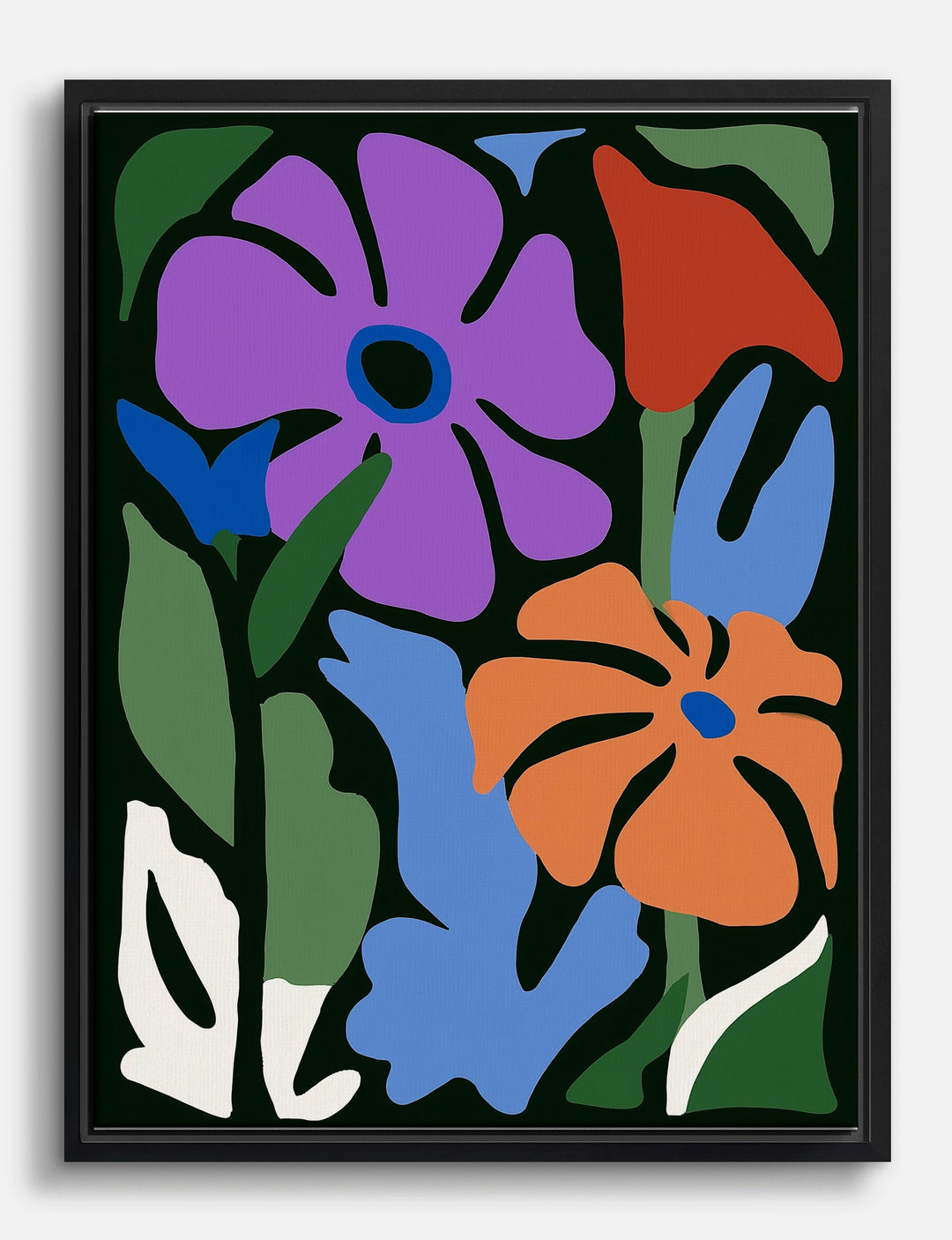 Color takes center stage with this vibrant burst of abstract florals. Purple, orange, and blue petals leap from the dark background, instantly energizing your space and inviting joy into every day.