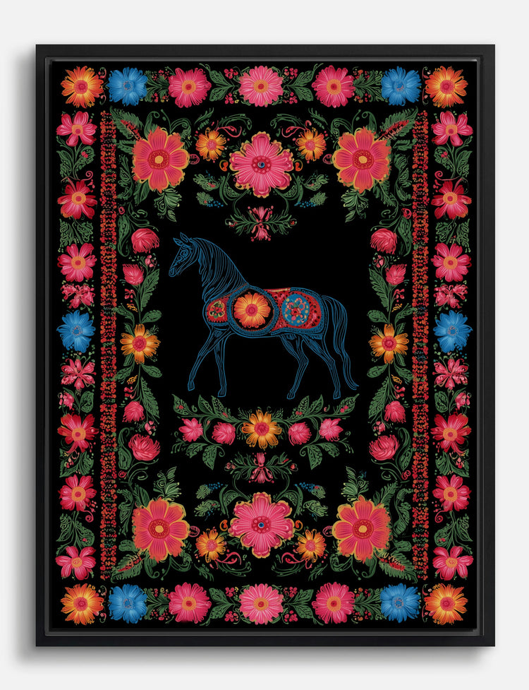 Bold color meets folk charm in this enchanting piece. A midnight-blue horse, adorned with vibrant florals, stands at the heart of a lush, blooming border—each petal and leaf bursting with joy. This isn’t just wall decor; it’s a celebration of life and artistry that instantly energizes your space. Whether you hang it in your living room or bedroom, you’ll love how the saturated pinks, reds, and blues add a playful, maximalist vibe. The intricate patterns and classic folk motifs invite warmth and personality, making your home feel curated and uniquely yours. Let this print be your daily reminder: style should be joyful, and your home is your canvas. With Fab, transforming your space is effortless and affordable—no renovation required, just a dash of artful spirit.