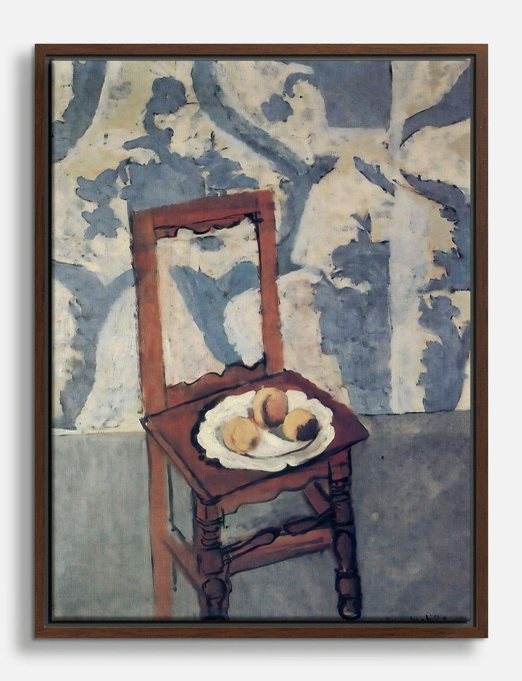 Step into a world of serene elegance with Matisses charming depiction of a simple chair adorned with fruit. This piece brings a touch of rustic warmth to your living space, blending effortlessly with both modern and vintage decor. Its muted palette and thoughtful composition create a calming atmosphere, perfect for your kitchen or dining room. Transform your home into a haven of style and comfort with this timeless piece.