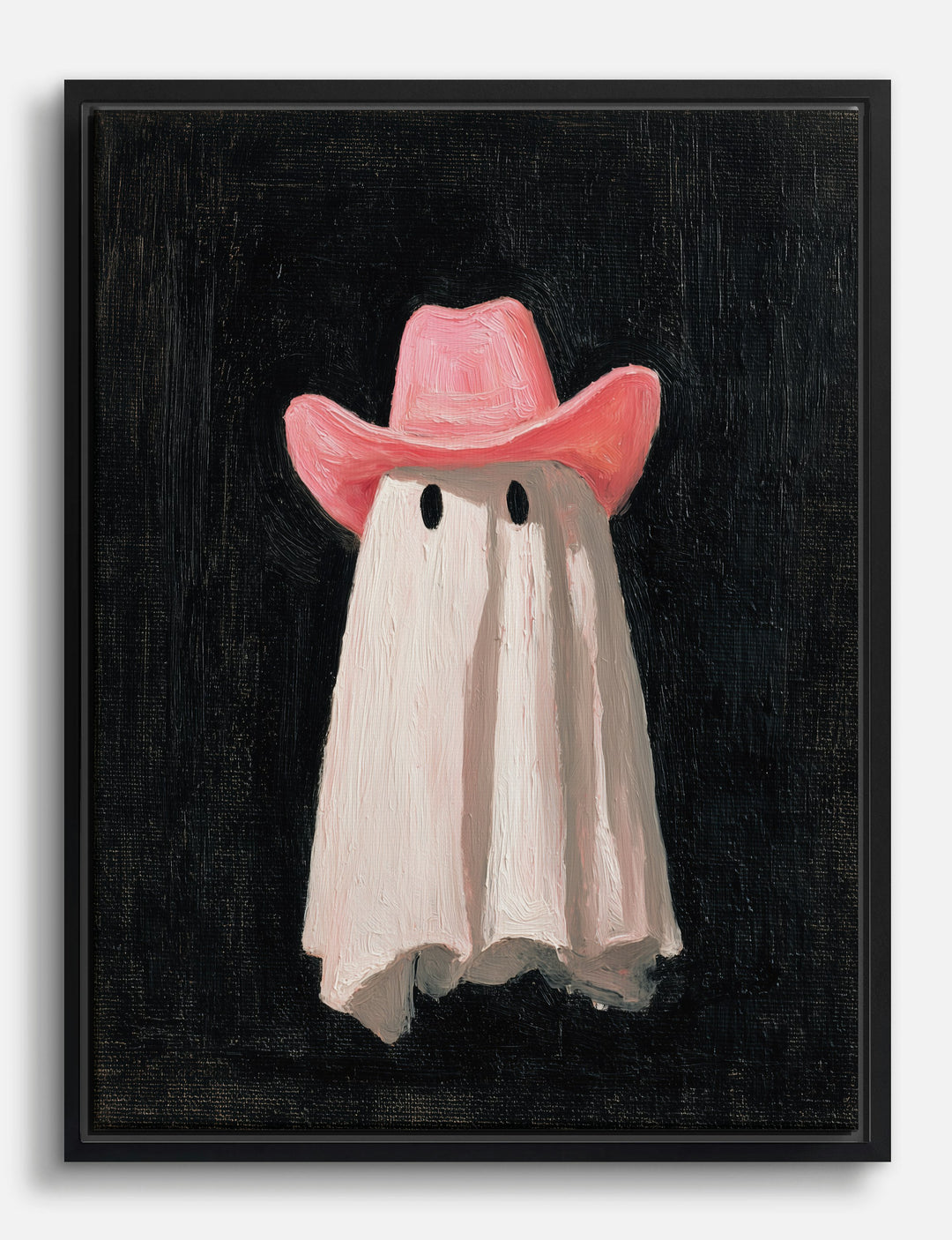 Who says spooky can’t be stylish? Meet the Pink Cowboy Ghost—a playful twist on classic western vibes, ready to liven up your walls. With its soft white sheet and bold pink hat, this piece adds a spark of whimsy and a dash of fun to any room.