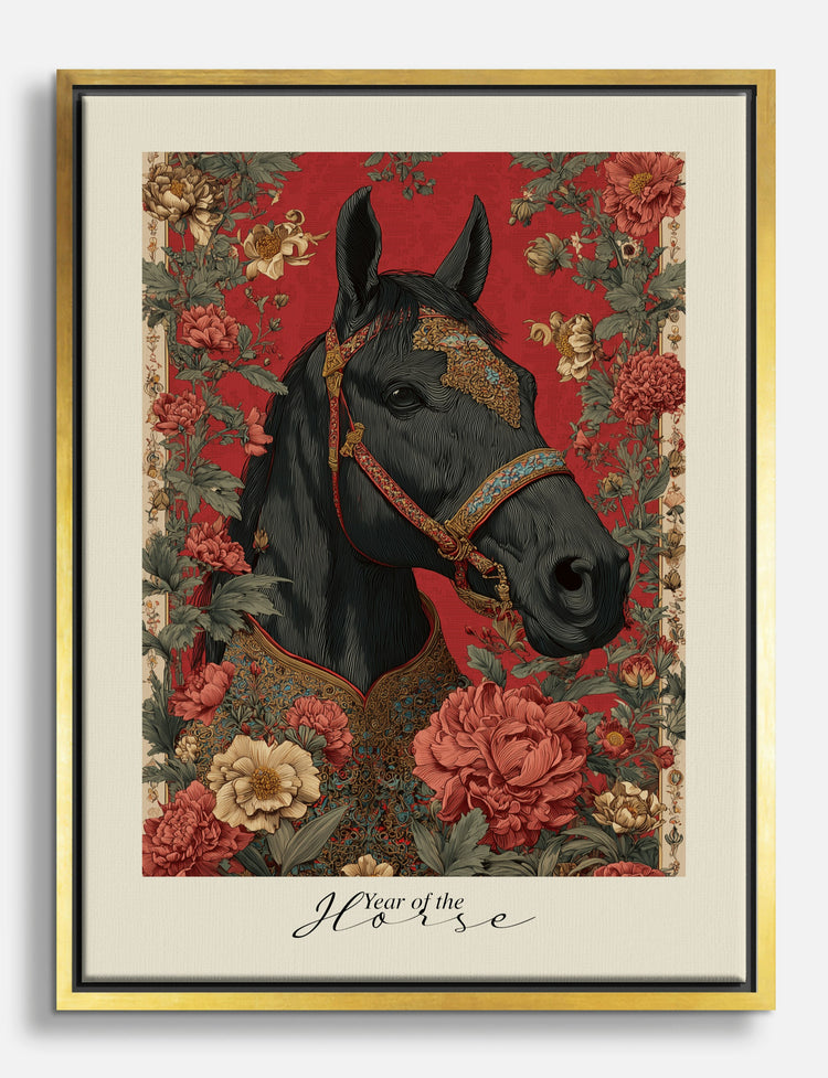 Bold confidence radiates from this striking portrait—a majestic black horse adorned in intricate gold filigree, surrounded by lush, blooming flowers on a rich red backdrop. This piece instantly brings a sense of strength and elegance to your space, celebrating both beauty and resilience. Picture it above your sofa or in your bedroom, where its deep reds and earthy florals add warmth and drama, pairing beautifully with both modern and vintage-inspired decor. The detailed florals and ornate accents invite admiration and spark conversation, making your home feel uniquely yours. You don’t need a grand estate to enjoy this kind of statement—just a love for art that empowers and transforms. With Fab, you’ll find it’s easy to make your space as bold and unforgettable as you are.