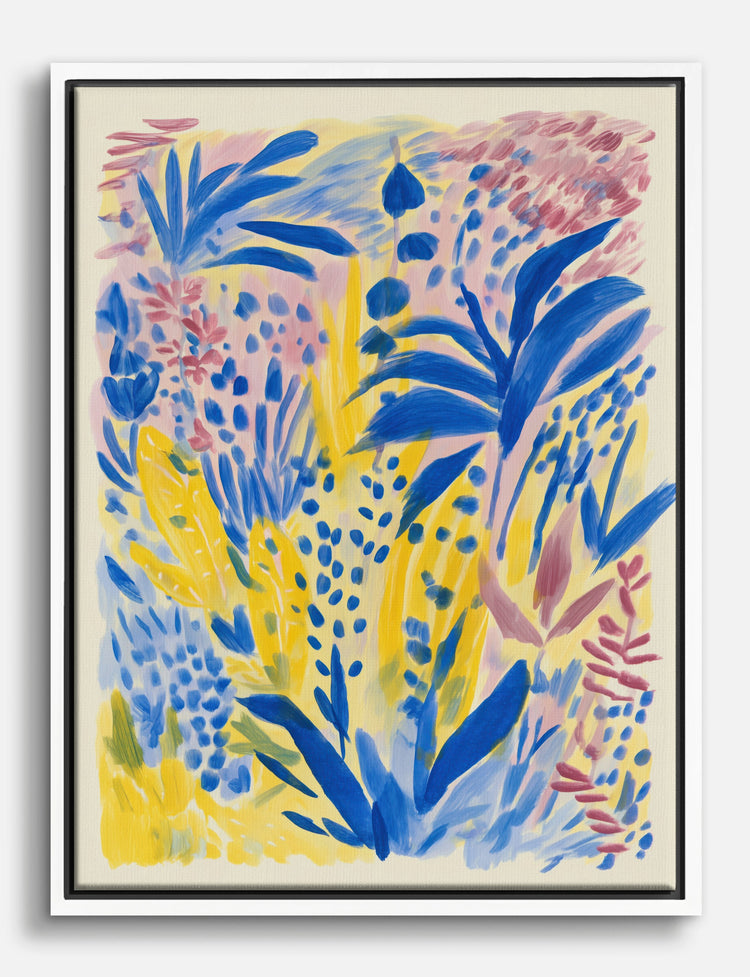 Bold strokes of cobalt blue and sunny yellow bring a rush of energy to any wall. This vibrant botanical composition instantly freshens up your space, making every day feel a little brighter.