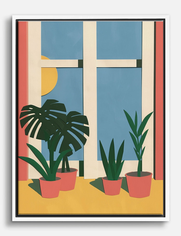 Breathe life into your space with this vibrant depiction of indoor plants basking in the sun by a window. The playful colors and clean lines create a refreshing atmosphere, perfect for brightening up your living room or office. Let this piece inspire a sense of calm and joy, effortlessly complementing any modern or minimalist decor with its cheerful palette.