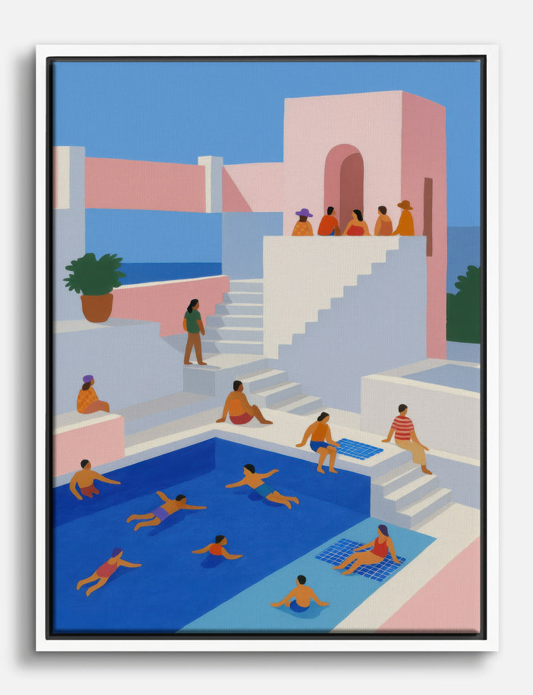 A splash of Mediterranean charm brightens your space with this vibrant scene. Crisp pinks, dreamy blues, and warm terracotta invite you to relax, unwind, and daydream of sun-soaked afternoons. Hang it in your living room or bedroom for an instant getaway vibe — no passport required.