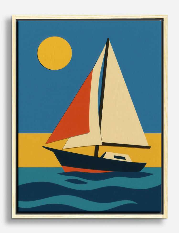 Feel the breeze of freedom with this vibrant sailboat piece. The bold shapes and sunlit colors bring a sense of adventure to your walls, perfect for energizing your living room or office. Its playful palette of blues, yellows, and reds effortlessly complements modern and nautical decor styles, transforming your space into a seaside escape.