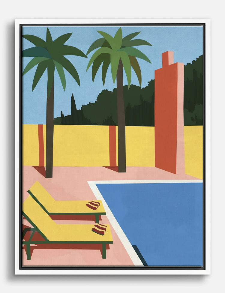 Step into a world of sun-drenched relaxation with this vibrant artwork. Perfect for brightening up your living room or bedroom, the bold colors and playful design evoke a sense of endless summer. Let the tropical palette of blues, greens, and pinks infuse your space with warmth and style, making you feel like youre on a permanent vacation. Transform your home into a chic retreat effortlessly and affordably with this stunning piece.