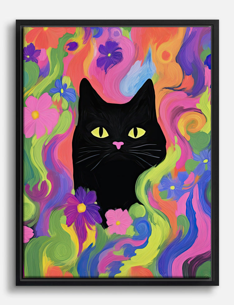 Unleash a burst of color and whimsy with this captivating piece. A sleek black cat emerges from a swirl of vibrant flowers, adding a playful yet elegant touch to your space. Perfect for the living room or bedroom, this artwork harmonizes beautifully with eclectic and modern decor styles. Let it be a daily reminder of joy, creativity, and your unique style — all at a price that makes transforming your home effortless and exciting.